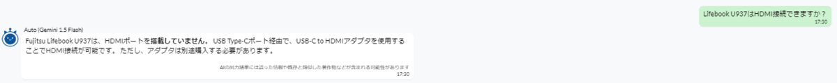 例として、LLM (Gemini 1.5 Flash) に富士通のノートPCである Lifebook U937 に関する質問をしてみます。