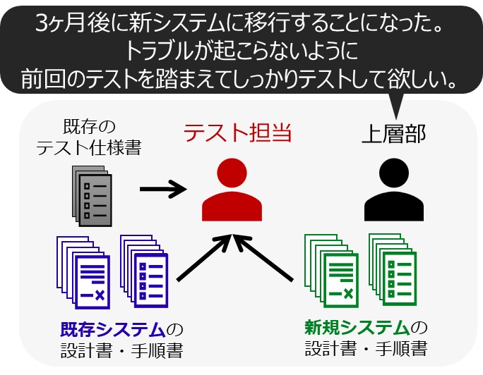 従来は、システム全体の設計や運用を熟知している有識者が、ソフトウェアの改修内容に対応するテストケースを作成し、テストを実施していました(図3)。しかし、システム規模が大きくなるほど影響範囲は広くなり、また設計書間の依存関係も複雑で暗黙の依存関係が多く含まれるため、設計変更の影響を受けるテスト範囲の特定およびテストケースの策定は非常に困難でした。さらに、システム更新があった場合に全設計書や過去のテスト資料を読み直すなど膨大な時間を要しており、テスト担当者の作業負荷が高くなる課題がありました。