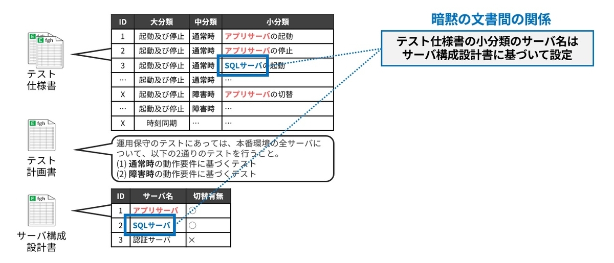 しかし残念ながら、このような「テスト仕様-根拠記述」間の関係性(トレーサビリティ)は多くの場合手に入らないか、あっても不完全なものでしょう。すなわち、関係性が暗黙知化したり、失われたりしているのです。図4に示したテスト仕様書にはシステムを構成する各種のサーバの起動や停止に関するテスト項目が列挙されています。ここで、実のところテスト仕様の「小分類」には「サーバ構成設計書」に記述された各サーバを列挙するというルールがあるのですが、それは暗黙知化しています。