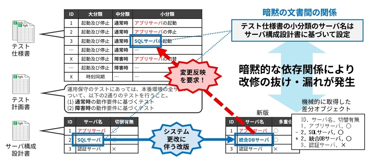 ここで、図5のように仮にサーバ構成設計書が改修されるとしましょう。改修前はSQLサーバとなっていたものが、統合DBサーバという別種のサーバに変わっています。この変更はテスト仕様書にも反映されるべきなのですが、もし先の暗黙知化した関係性を知っている有識者が全員いなくなっていとしたら、どうでしょうか。誰かがこの関係性に気づくまで、テスト仕様書の改修を見落としたり、最悪の場合、古い記述に基づくテストが削除されるだけになるかもしれません。
