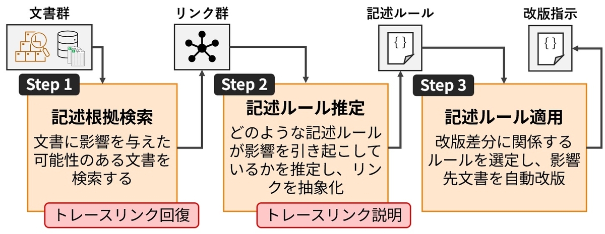 幸いなことにわたしたちの目的は明らかで、それは (目的A)テスト仕様書に影響を与えた設計文書を特定し、 (目的B)その設計文書を変えるとテスト仕様書にどう影響するかを説明することです。そこで、あるテスト仕様(の集合)が記述される原因となった作業手順(記述ルール)を説明できれば、改修影響波及という観点でのリンク回復・説明を達成できると考えました。その上で、図6に示すような3ステップに問題を分割して解くことを目指しました。